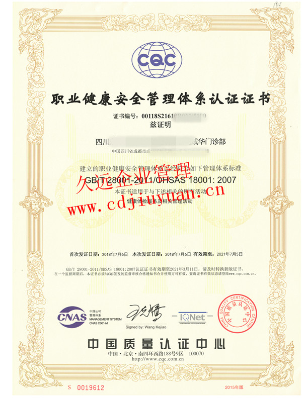 職業健康安全管理體系認證證書